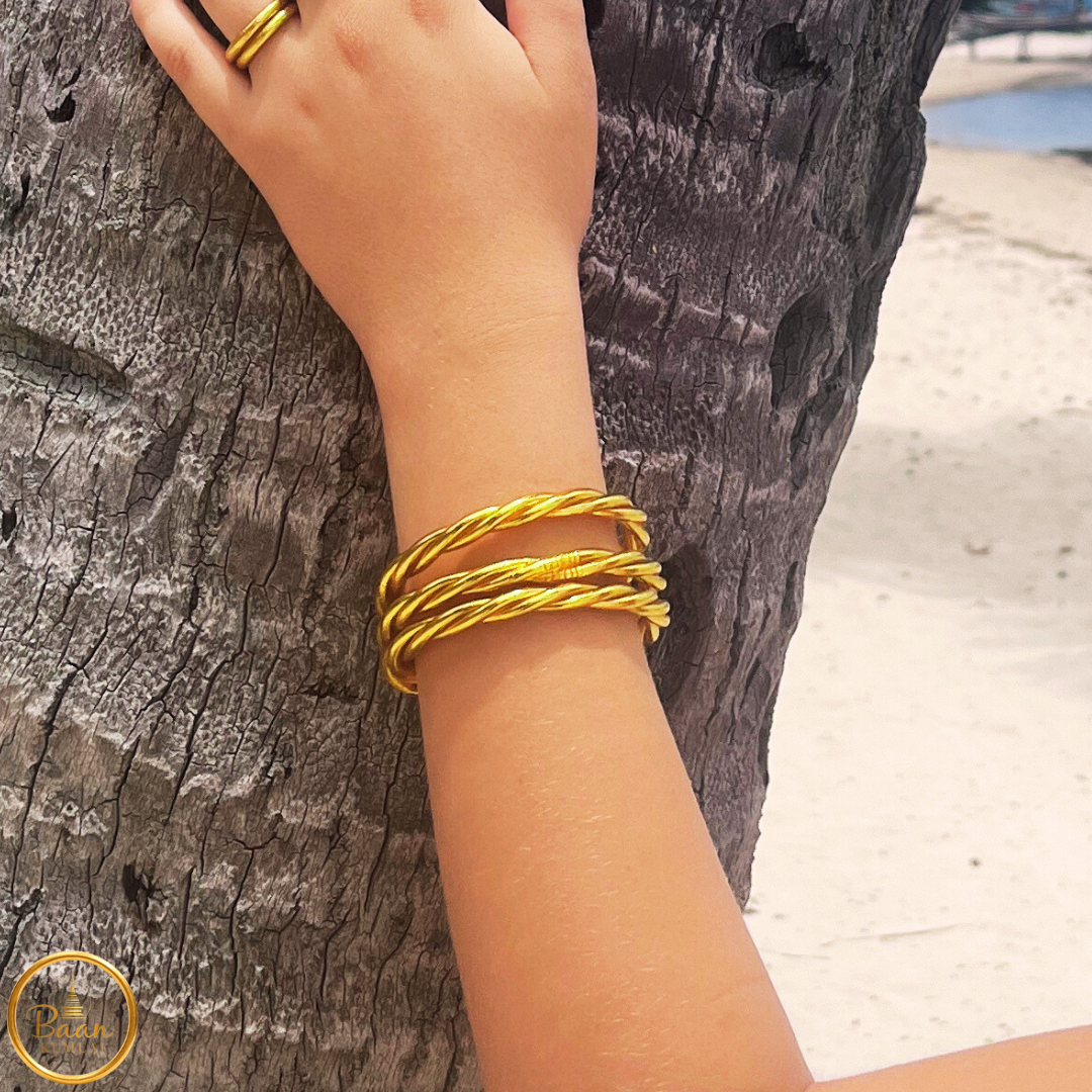 Le Jonc Bouddhiste Torsadé Or Bâan Kumlaï est composé de trois tubes de 3 mm, chacun rempli de véritables feuilles d’or avant d’être scellé. Entièrement fabriqué à la main en Thaïlande, ce kumlai torsadé est un bracelet authentique au style élégant et structuré.