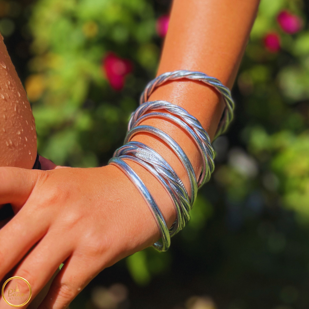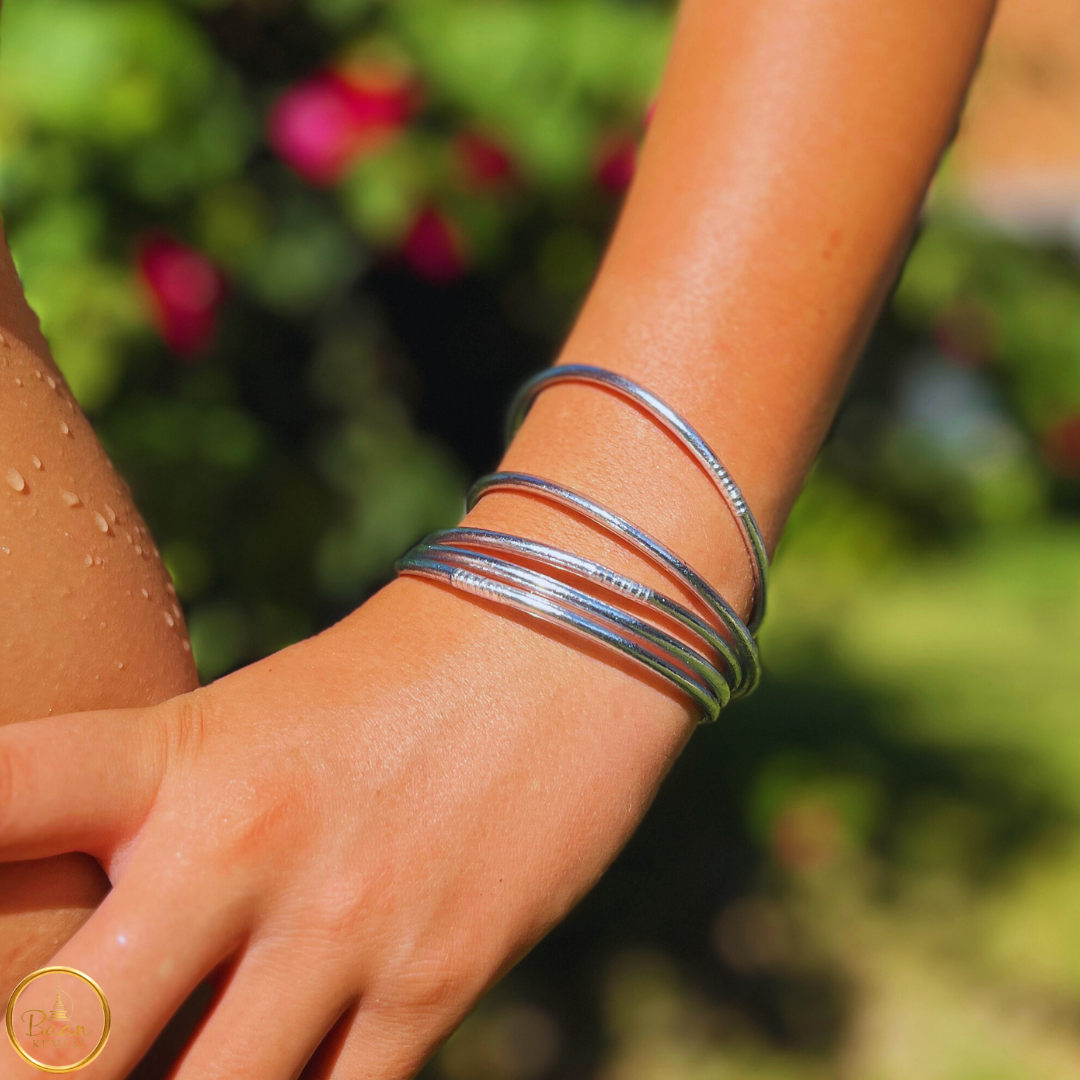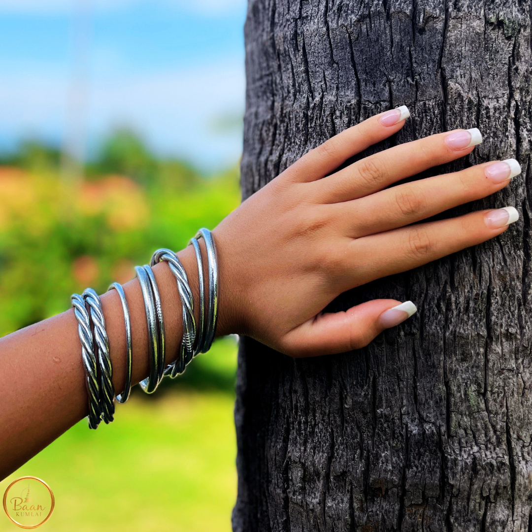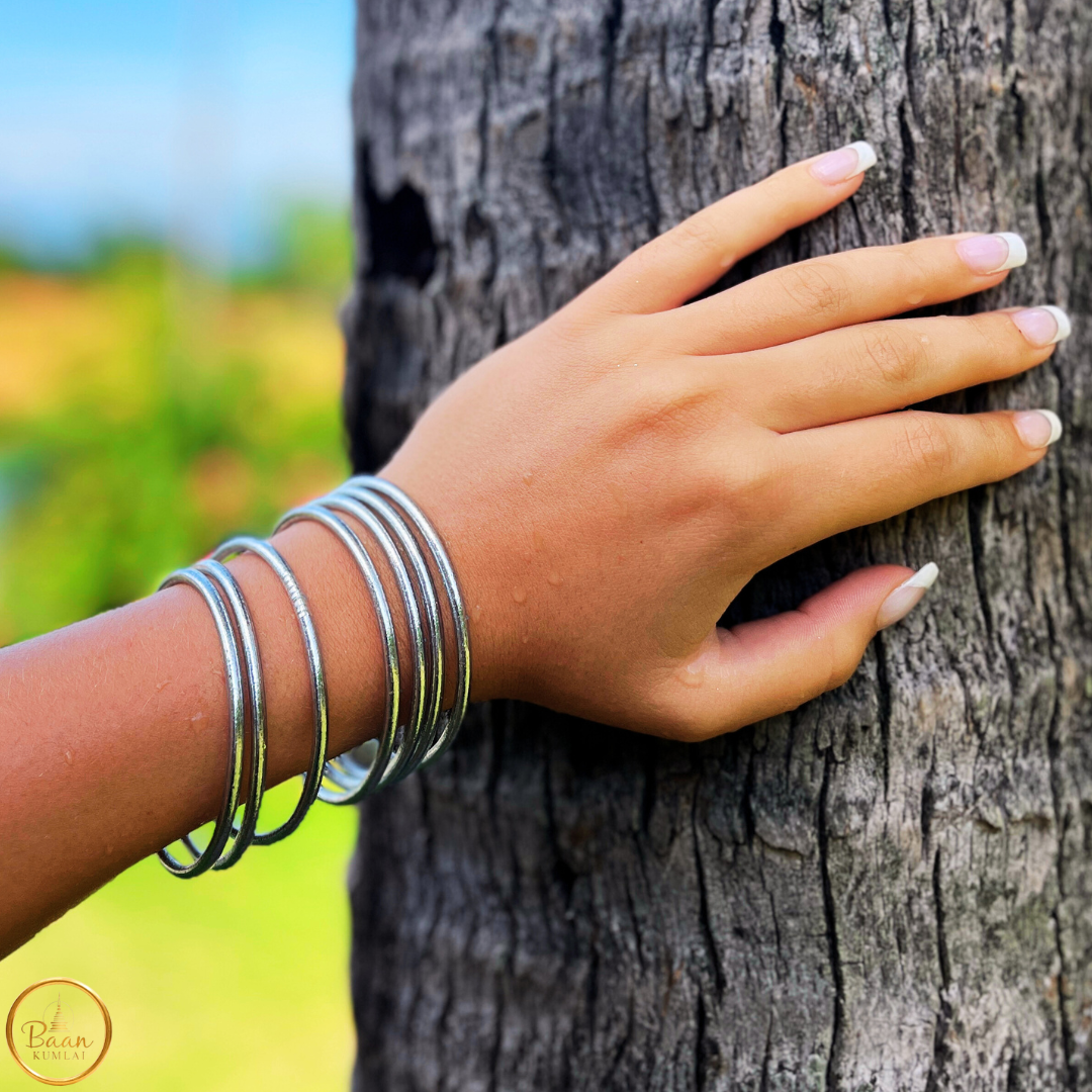 Le Jonc Bouddhiste Argent Fin Bâan Kumlaï renferme de véritables feuilles d’argent, glissées dans un tube fin et souple. Ce kumlai argenté, fabriqué à la main en Thaïlande, est un bracelet authentique apprécié pour son éclat frais et discret.